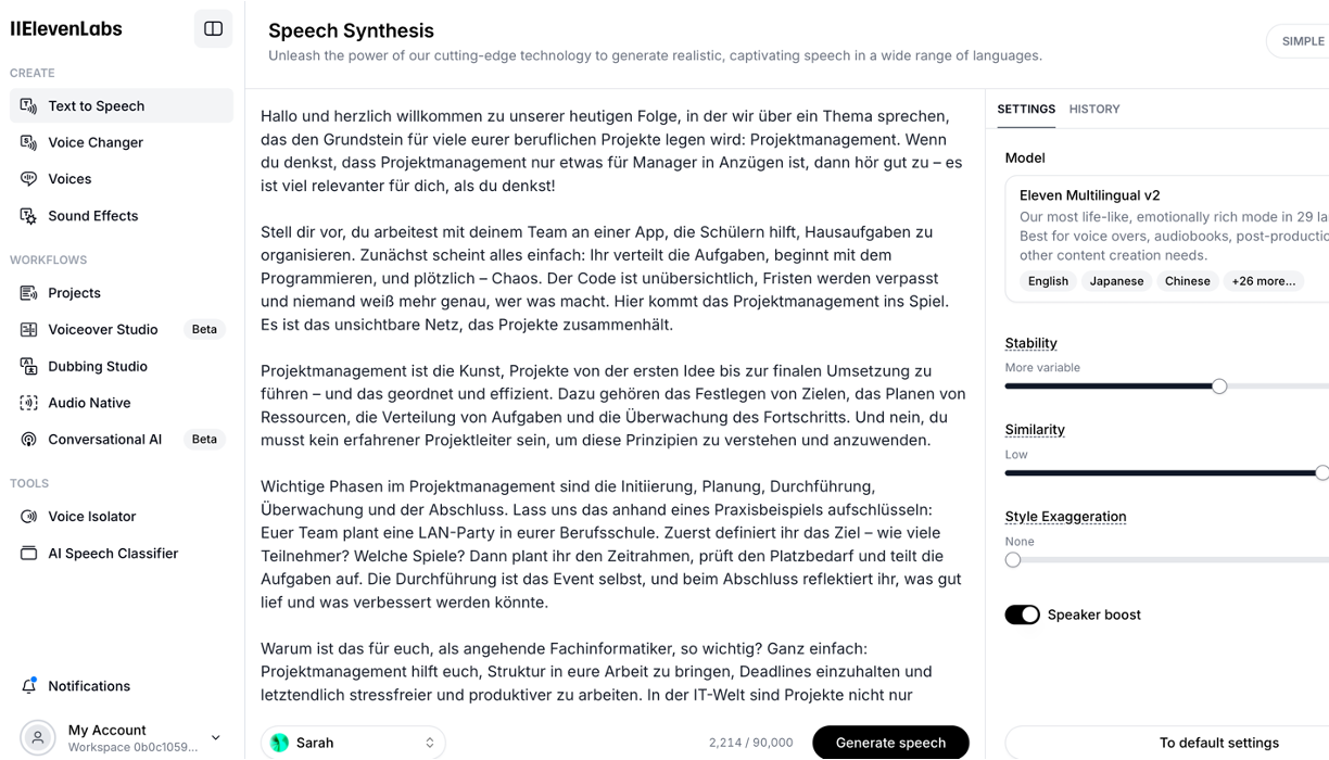 Nutzen Sie eine Text-to-Speech-Software wie Elevenlabs, um den Text in eine Audiodatei umzuwandeln. Achten Sie darauf, eine natürliche und ansprechende Stimme auszuwählen.
